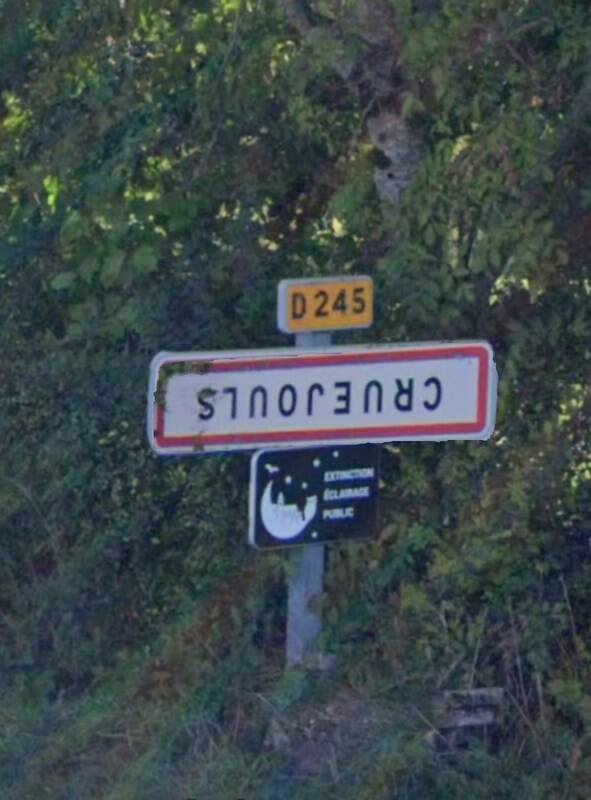 Cruéjouls : Entrée du bourg : Tiens le syndicat des agriculteurs est passé aussi par là, comme dans toutes nos bourgades. ; "Cruéjouls marche sur la tête" ! Franchi ce panneau, on perçoit tout de suite l'investissement de l'association La Cardabelle pour son village : préserver son patrimoine et sa culture.