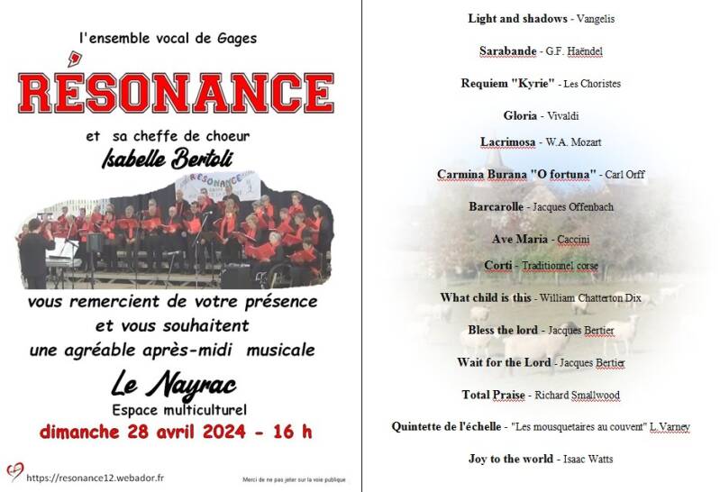Le répertoire est riche de grandes œuvres : Carmina Burana, Haëndel, Vivaldi, Mozart, Offenbach, de musique de films : Vangelis, les Choristes, et des gospel et opéra. Une heure de musique sur tous les tons, et notre cheffe, vive et enjouée pour nous mener « à la baguette » et nous accompagner.
