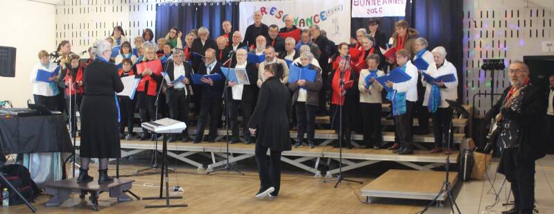 Petit entracte, le temps de quelques mises en place et nous accueillons les choristes d’Au Chœur des Flots et leur cheffe Isabelle Bessières. Changement de couleurs, du noir et rouge, nous passons au blanc et bleu. La fin de concert sera très patriotique ! (sourire). Isabelle (2) a établi son programme en fonction de critères particuliers qu’elle nous explique lors de sa présentation. Les mélomanes reconnaîtront aisément Ronsard (Mignonne, allons voir…) Bepi di Marzi, un chant basque, Fauré etc.. et plus récent, Et bam (Mentissa/Vianney). Après une belle ovation, Résonance rejoint Au Chœur des Flots sur les estrades.